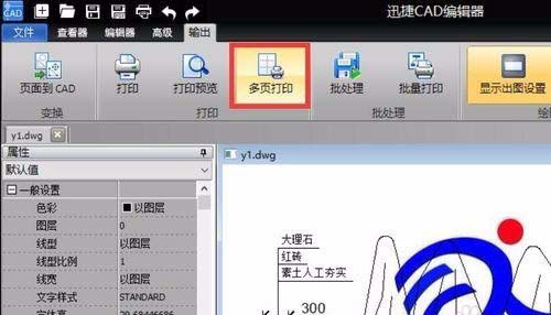 3、如果想对当前CAD图纸进行多页打印操作,我们需要切换到“输出”选项卡,点击“多页打印”按钮。如图所示: