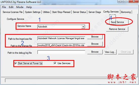 10、打开C:\Autodesk\Network License Manager目录,运行“lmtools.exe”,点击Corifig Services项目,新建一个Name为:Autodesk,然后点击下面Browse载入,“lmgrd.lexe”在当前目录下,直接点击打开即可,“license”文件就是我们刚才修改的许可,将查找方式修改为“.dat”就可以看到,然后勾选下面两个选项,点击Save Service保存