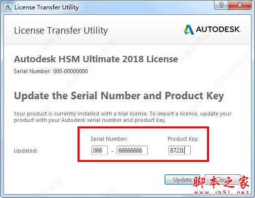 12、运行HSMWorks2018快捷方式,弹出界面输入序列号066—66666666,输入KEY:872J1(注意:Premium版本和Uitimade版本的许可不一样,我们根据安装时候选择的版本输入即可)