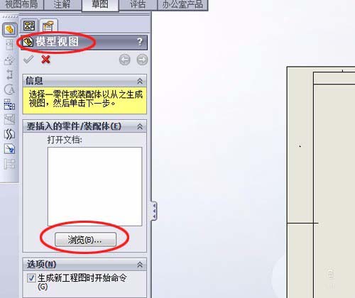 1、打开SolidWorks 2013软件,单击菜单中“文件”—>“新建”,在弹出的对话框中单击“工程图”按钮,然后在弹出画面左边的“模型视图”属性管理框中单击“浏览”按钮,如下图