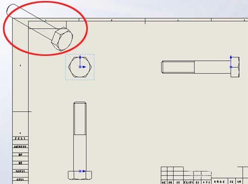 6、如下图将鼠标移动到主视图左上角,单击鼠标左键放置零件立体三维示意图
