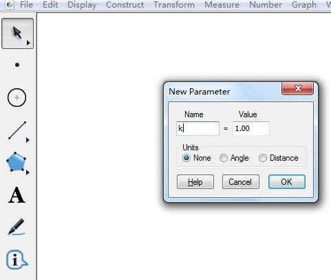 1、新建参数k。打开几何画板,单击上方菜单栏“数据”菜单,在其下拉选项选择“新建参数”,这样就会打开新建参数对话框,输入名称“k”,单位选择无,然后单击确定,这样就新建好了参数k。