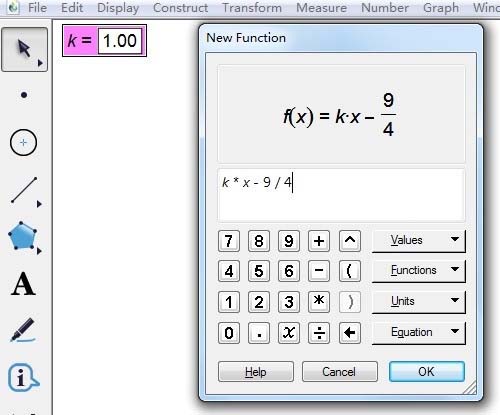 2、输入函数解析式。鼠标单击上方菜单栏“绘图”菜单,在其下拉选项选择“绘制新函数”命令,这样就打开的新建函数对话框,左键单击刚才建立的参数k,再依次输入*、x、-、9、÷、4,如下图所示。