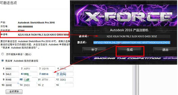 再将注册界面中的申请号复制到注册机中的请求码框中,然后点击生成按纽,得到激活码;