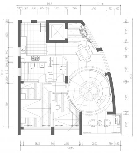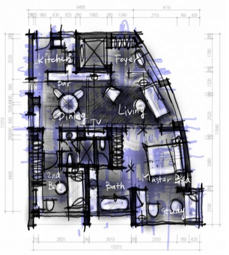 然后就是完善自己的设计:可以换一个思路,在小单元应该尽量减少纯交通面积,增加空间的流动性,快速的草图可以整理自己的思路,表达设计的想法。