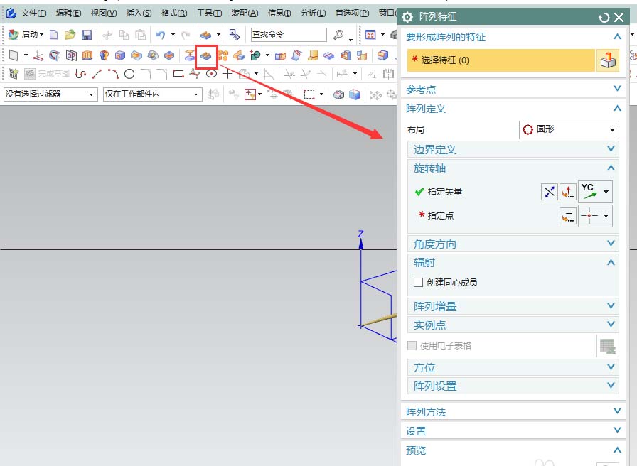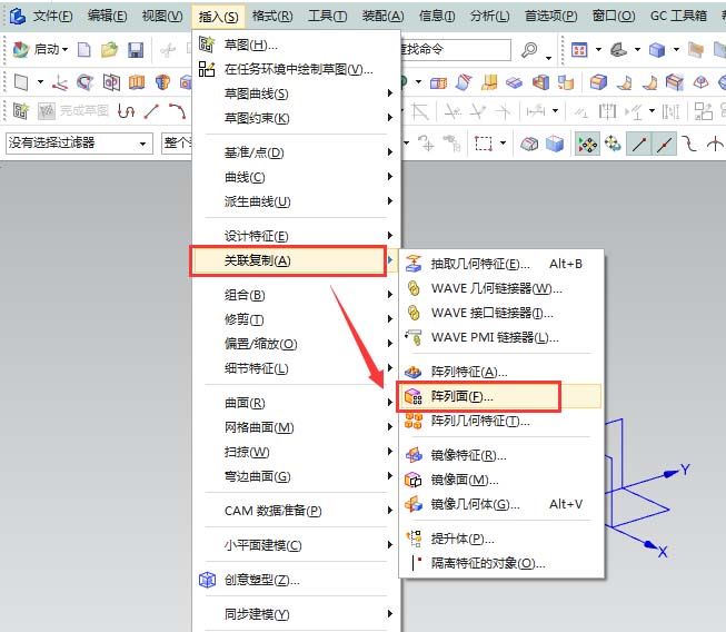 2、如下图,要对圆柱上的小孔阵列,因为它是曲面,只能使用阵列面;