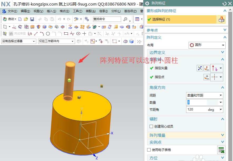 2、如下图,需要对大圆柱上的小圆柱进入复制,这时就只能选择阵列特征,因UG要阵列的是大圆柱上的小圆柱特征;