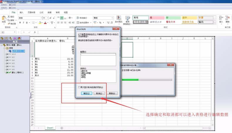 3、想要进入设计表中修改数据,右键单击系“列化零件设计表”,选择“编辑设计表”,出现下图的界面,选中“确定”或“取消”都能进入表格进行编辑。
