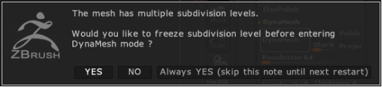 这里可以用一个有3级的细分等级的球体练习。点击Dynamesh按钮→弹出一个对话框→选择YES→再次点击Dynamesh按钮→关闭Dynamesh按钮和Freeze Subdvision levels按钮。这个时候我们发现细分等级还在,这个功能一定要重视:
