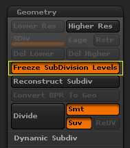 3、意思是说模型有细分级别,问你是否要冻结。Zbrush 4R2也新增了一个冻结功能,这个按钮的位置在Geometry中,如上图蓝色框。如果我们选择 YES,那么软件就会自动开启Freeze Subdvision levels按钮。如果我们选择NO,那么细分级别就会被删掉。后面我们会详细的介绍冻结Freeze Subdvision levels这个按钮。