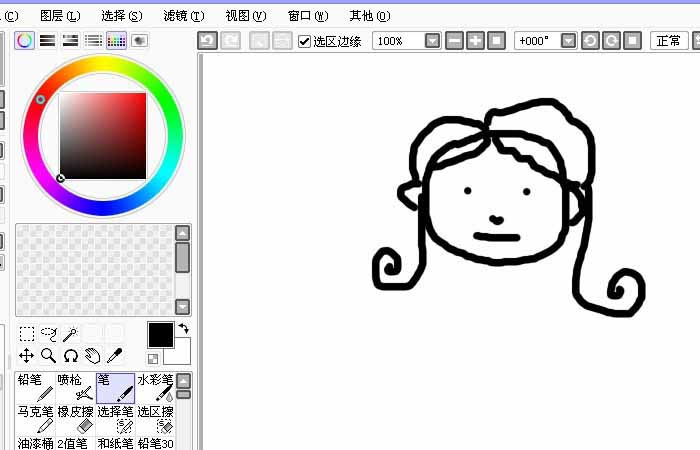 2、鼠标左键单击【确定】按钮后,在SAI软件的绘图区,可看到白色的画布,用铅笔工具,选择一个颜色,如黑色,然后在画布上画可爱的女孩的头型和头发,如下图所示。