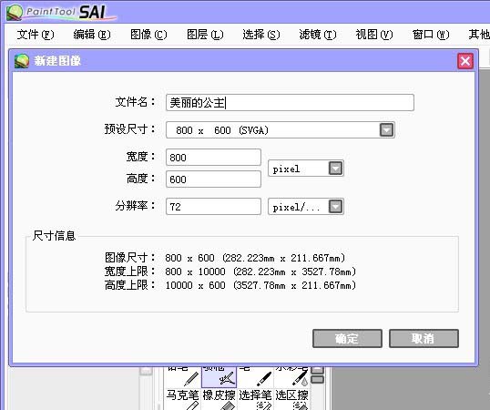 1、打开SAI软件后,鼠标左键在菜单【文件】>>【新建】单击,新建一个SAI文件,在新建的文件窗口上,可设置文件的大小,并重新命名,这里取名为美丽的公主,如下图所示。