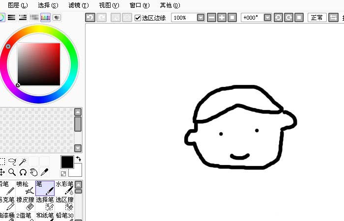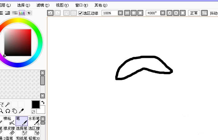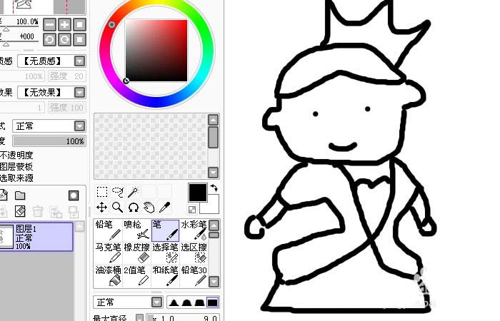 2、鼠标左键单击【确定】按钮后,在SAI软件的绘图区,可看到白色的画布,用铅笔工具,选择一个颜色,如黑色,然后在画布上画美丽的公主的头发,如下图所示。