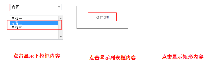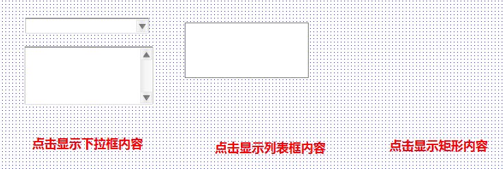 2、所有元件编辑如下所示,同时为下拉框、列表框和矩形分别命名为xia、lie、ju。