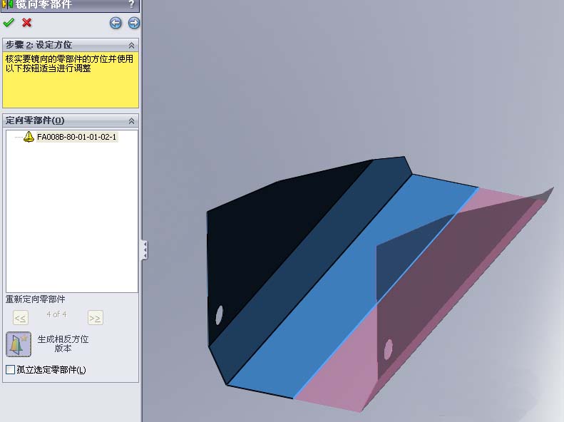 2、利用线性零部件下镜像零件命令完成镜像。在左侧配置栏内有方向、 方位等条件设置,可以设定出符合你要求的镜像零件。