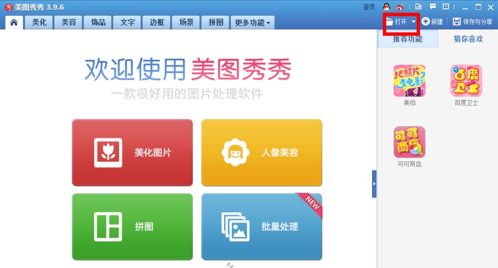 2、点击右上角的“打开”,选择电脑本机里的一张照片,打开。如图
