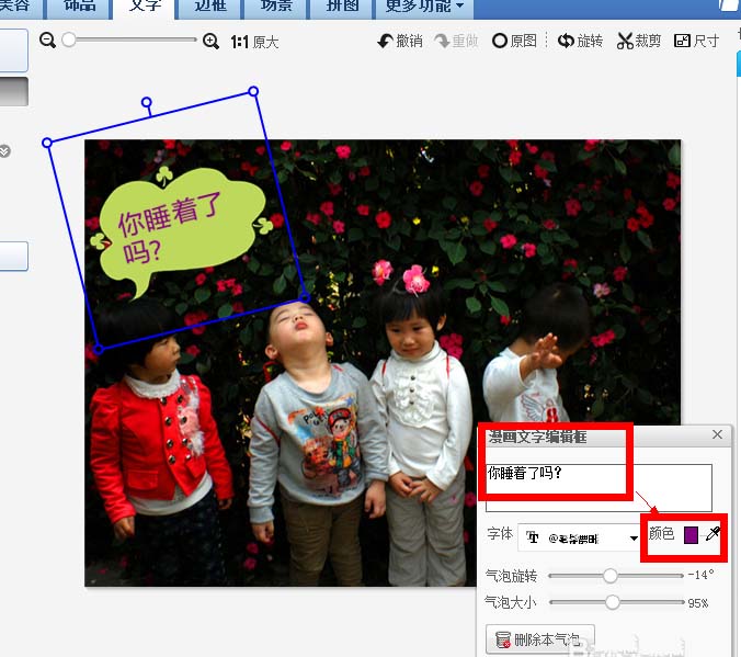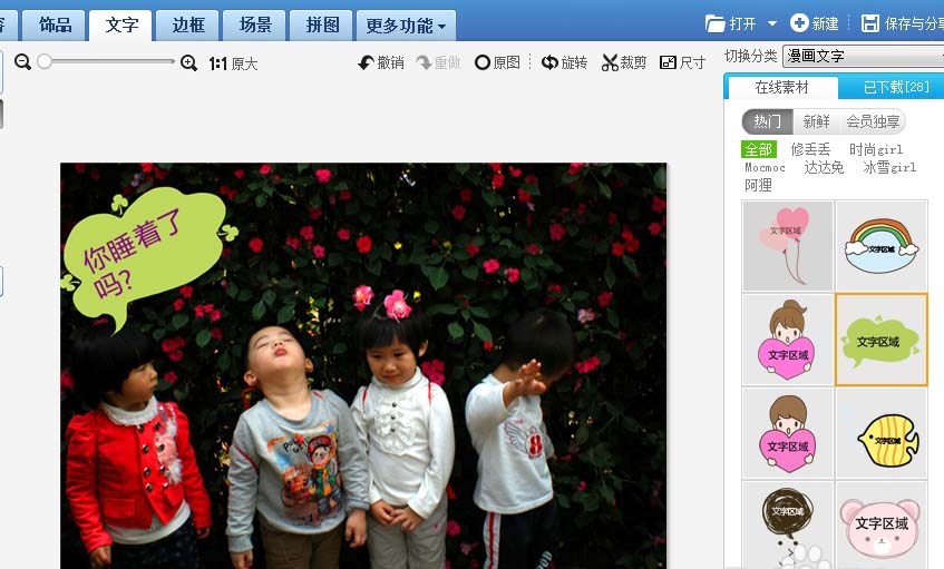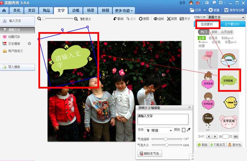 6、人物多的图片可以多添加几个会话气泡,在右边在线素材里选择气泡,和第四、第五的步骤一样,可选择不同款的气泡。