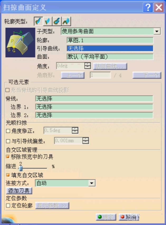 4、轮廓线和引导曲线分别选择刚才绘制的草图。子类型选择使用参考曲面
