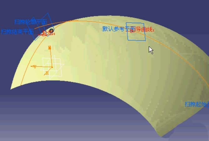 6、如果轮廓线和引导曲线调换所使用的草图,可以看到形成的曲面依旧会在轮廓线所在的曲面上。这个要注意。