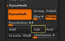 3、我们常用这种方法来做一些细节处理,比如衣服上的破洞效果或做出鞋子的空洞形状。同样差运算的界面按钮在DynaMesh菜单中的Sub,这个按钮我们不用去管他,只要知道它是干什么的就可以了,因为可以直接在空白处划一下就可以了。