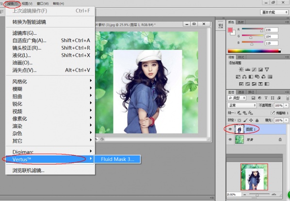 二:用移动工具将美女图片拖到风景图片中。选择图层1,然后单击菜单中的滤镜→Vertus→Fluid Mask3