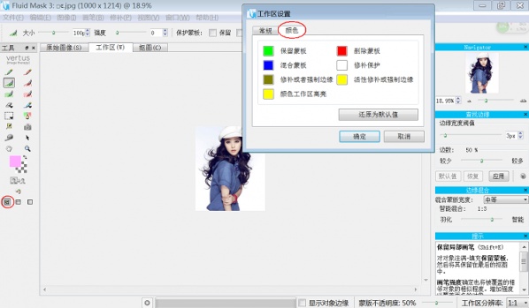 四:进入了vertus fluid mask3界面(最好选择标准界面)。图片自动处于工作区。左侧工具箱中常用的是上部的几个。每选一个工具,右侧下部的提示窗口内会有对应的解释。单击编辑→工作区设置,出现图中的设置对话框,注意一下颜色,默认即可。