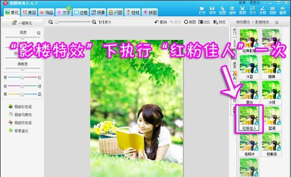 1、首先在软件中打开待处理的照片,在“美化”菜单下选择“影楼特效”,执行“红粉佳人”一次,让照片更加亮丽。