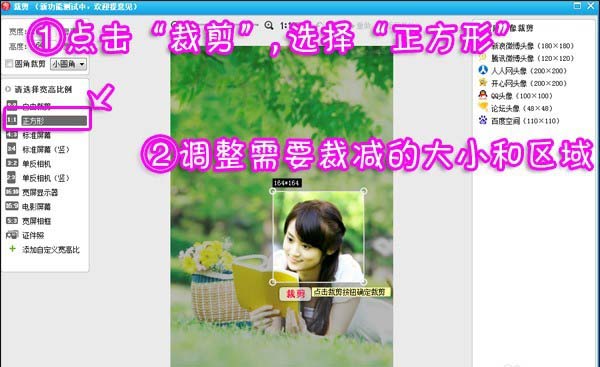 2、点击软件右上侧的“裁剪”按钮,跳转到剪裁界面后,选择“正方形”的宽高比例,调整需要裁减的大小和区域。