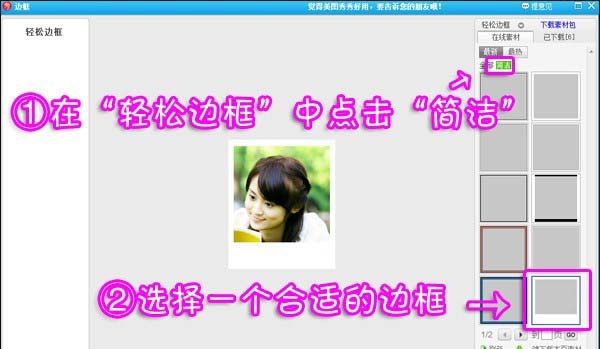 3、裁剪完后,进入“边框”菜单下选择“轻松边框”分类,点击“简洁”,选择一个“拍立得”效果的边框素材。