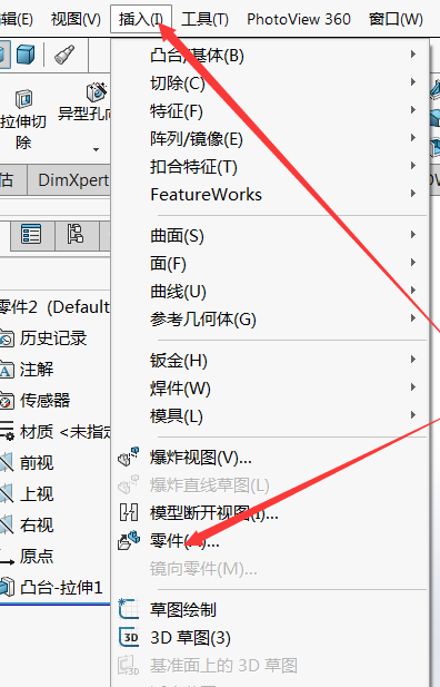 2、切换到长方体零件,鼠标单击插入标签展开下拉菜单,然后找到零件,如下图所示