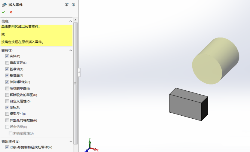 1、启动solidworks并打开两个零件。本例以简单零件为主说明方法。如下图