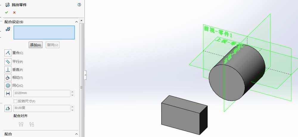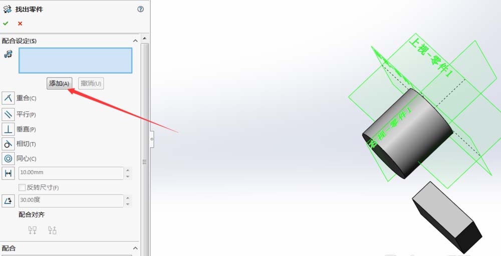5、如下图箭头所示,可以像装配体中一样通过配合确定零件摆放位置,可以通过添加按钮增加约束关系