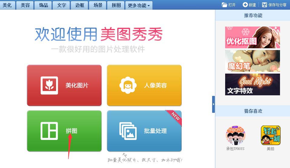 1、首先双击打开美图秀秀,再点拼图