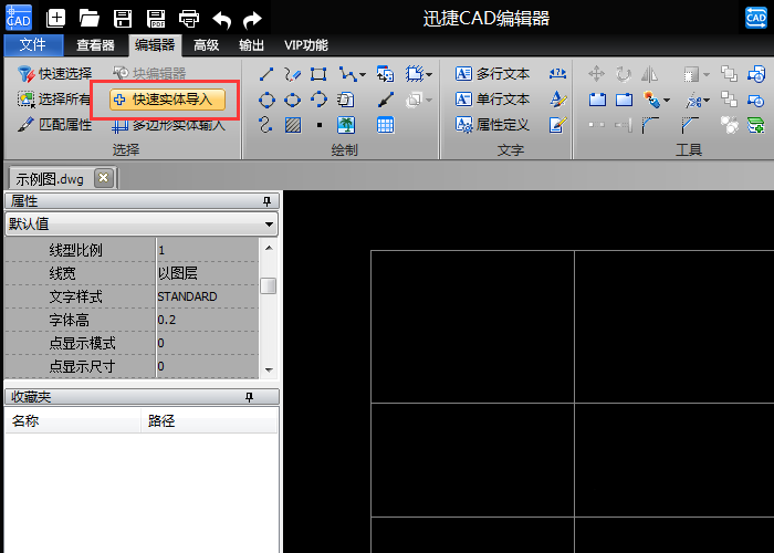 2、打开CAD图纸文件之后,切换到“编辑器”,若要连续使用某个绘图工具,那么首先需要点击选择“快速实体导入”。
