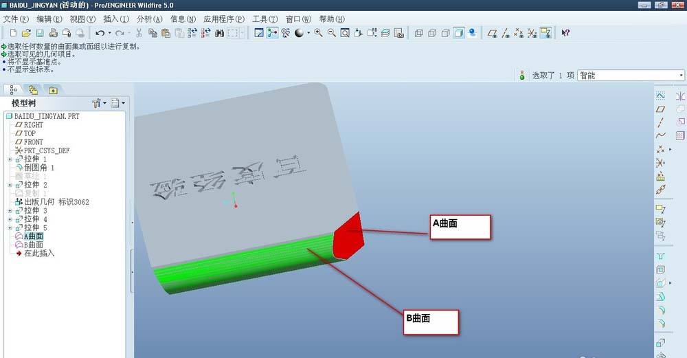 1、首先我们负复制了A曲面,并确认A曲面没有被隐藏。(这时B曲面是没有被复制的,是实体上的面)