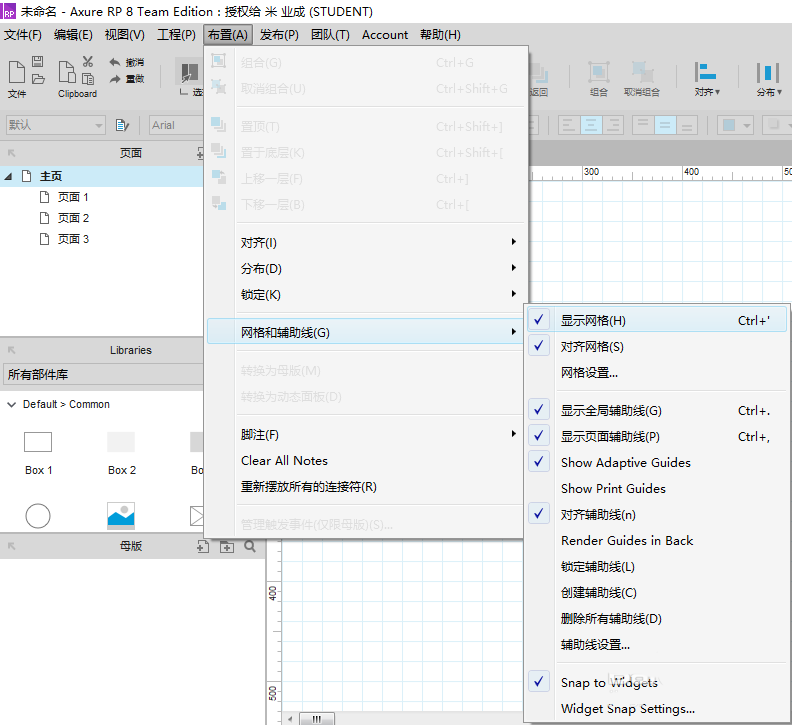 2、点击布置,选择网格和辅助线,根据需要进行调试。网格和辅助线对设计会起到辅助作用,如下图所示: