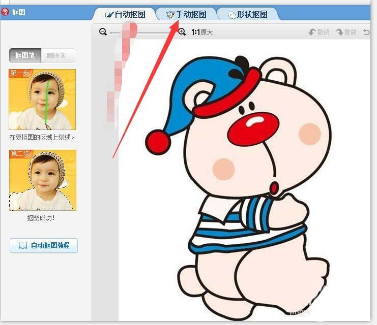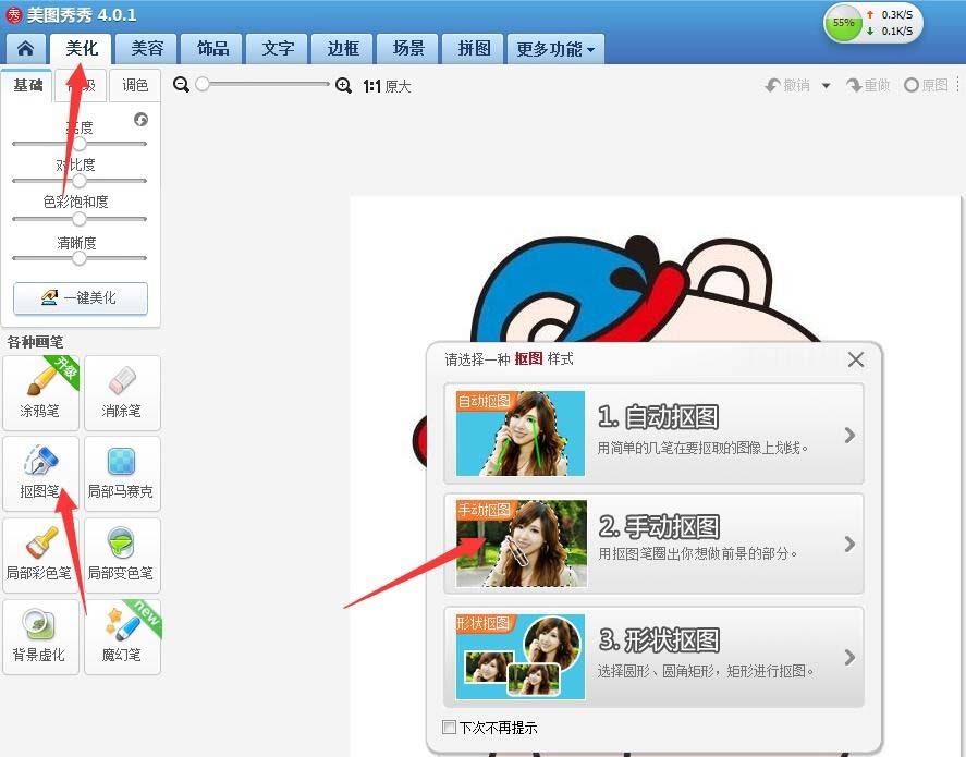2、打开图片后,在美化的选项下面选择抠图笔,在抠图样式中选择手动抠图。