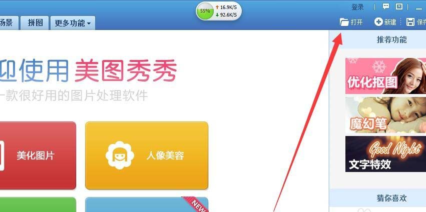1、打开美图秀秀软件,在右上角选择打开需要处理的图片。