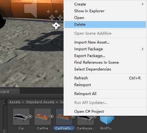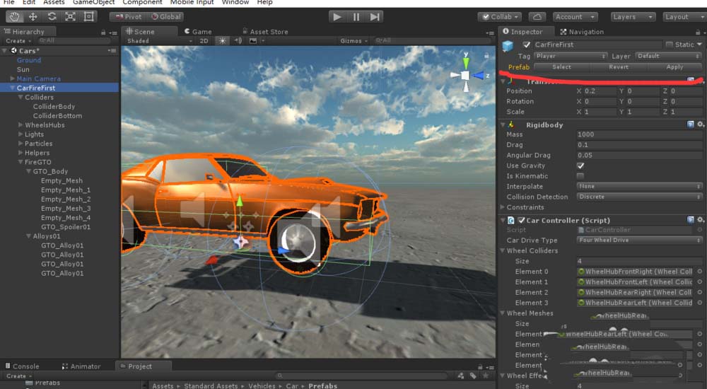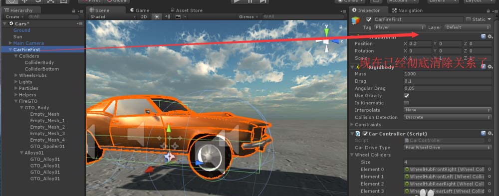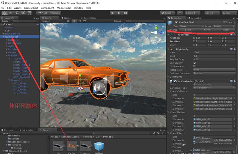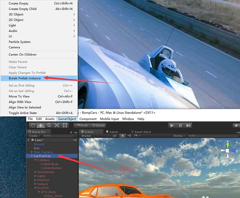 4、下面说彻底断开的办法。首先把这个变成白色了的游戏对象拖动到Project面板中再创建预制体(CarFireFirst),这样就改变了该对象关联的预制体。
