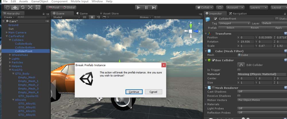 2、然后我们对这个游戏对象做一些修改。当我们试图删去子步件时,提示是否要Break Prefab Instance, 我们继续。(也可以直接从GameObject菜单下找到Break Prefab Instance)