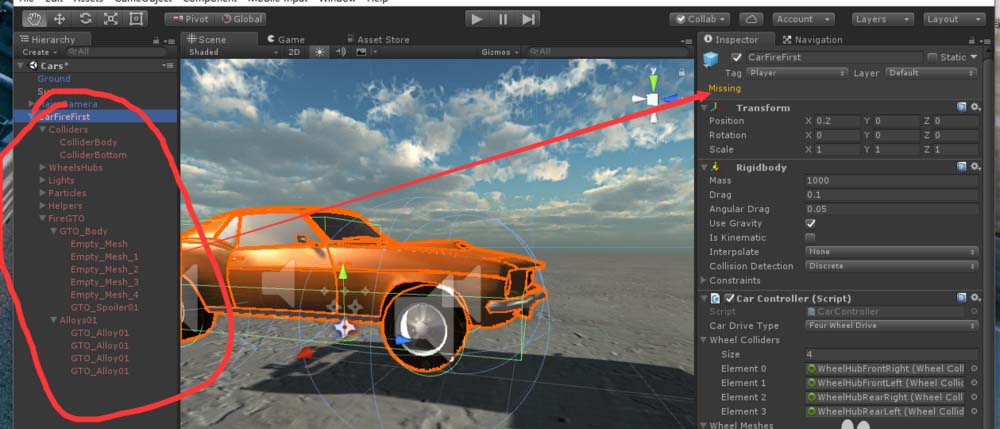 1、首先,为了演示,我们使用一个CarFire预制体拖动到场景中,重命名为CarFireFirst.