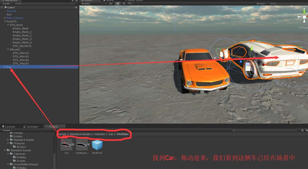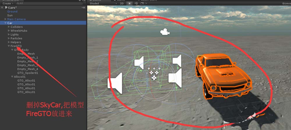 6、删去SkyCar子对象,把我们的汽车模型CarFire拖进来。