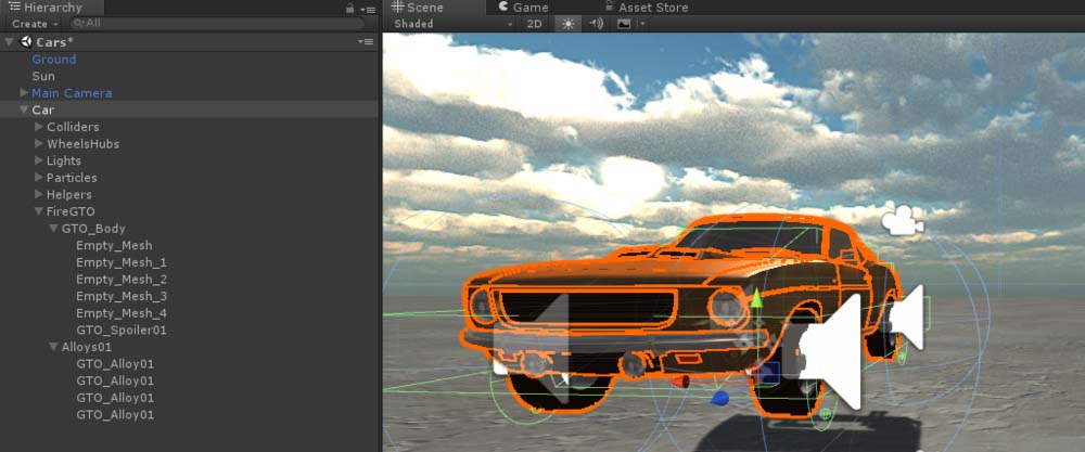 5、展开Car对象,我们看到其子对象SkyCar是汽车模型部分。