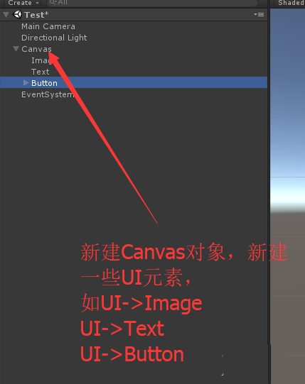 1、首先新建Canvas对象,新建子对象Image/Text, 当然还有Button