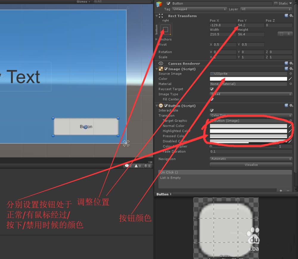 2、点击Button,在右边面板修改按钮颜色(样式),下面Button Script里面修改按钮处于不同状态(正常/有鼠标经过/禁用/按下)的颜色。
