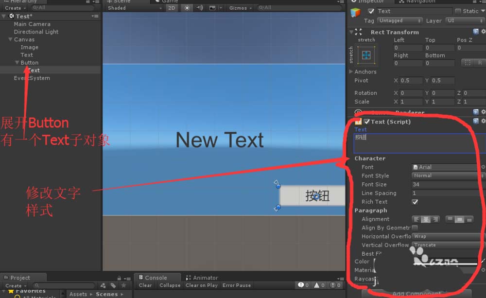 3、Button有一个子对象Text,就是按钮上的文字。修改文字大小内容等。