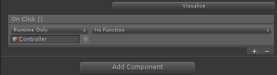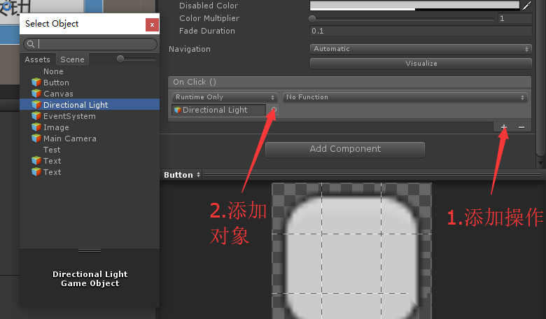 4、回到Button对象,在Inspector面板中,下面有一个OnClick小面板,点击加号添加一个。然后添加按钮要处理的对象。