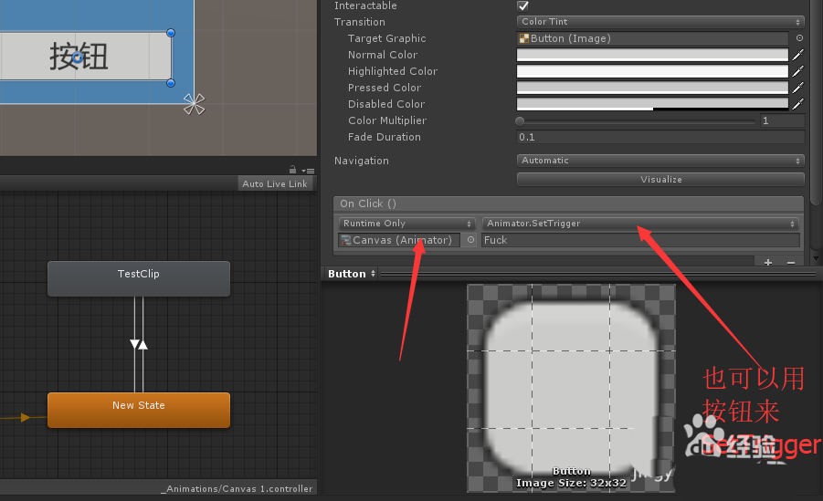 6、同样的,我们也可以用按钮来作为动画的触发器。把带有Animator的对象拖上去,然后设置Function为Set Trigger(string), 再输入Trigger变量的名称。等等,按钮还有很多用法。