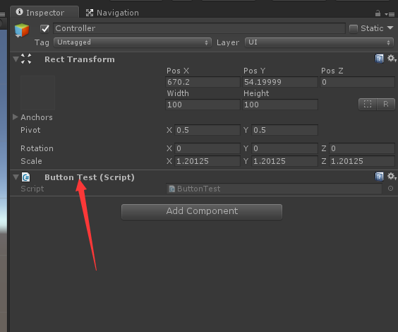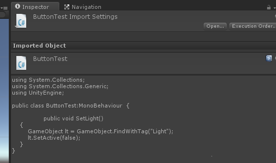 7、实际上,我们也可以让按钮运行自己写的代码。写一个脚本ButtonTest,在里面写一个SetLight的函数。然后新建一个空对象命名为Controller,把脚本放上去。