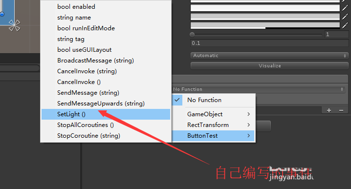 8、把Controller对象拖上去,然后在Function里面就可以找到这个脚本了,选择自己写的SetLight函数就可以了。这样就使按钮运行了自己写的代码。